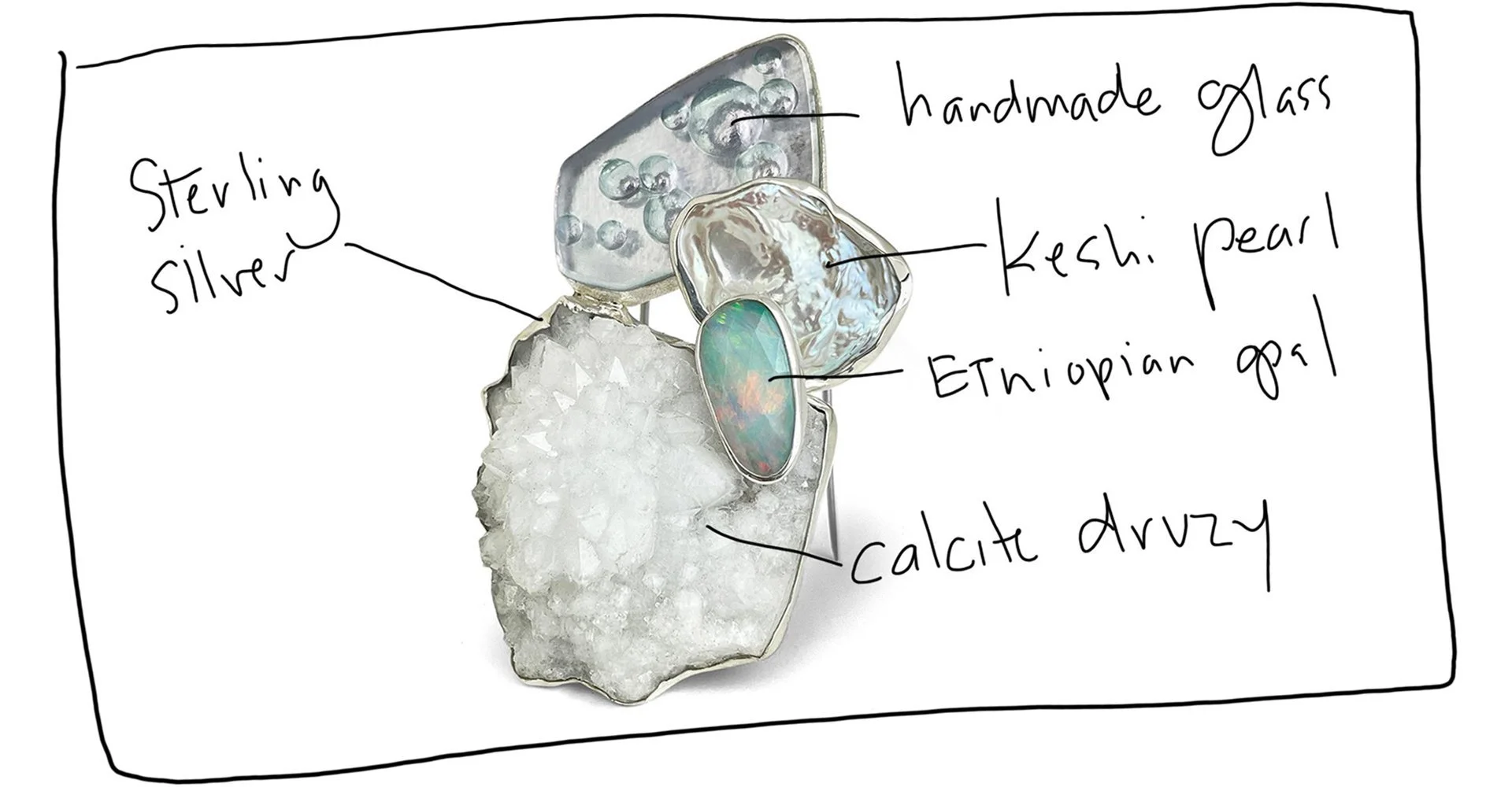 I follow the dialogue between glass, metal, and gemstone, allowing each material to contribute to the movement, balance, and depth of the piece. The result is jewelry that’s not just worn, but experienced—a one-of-a-kind reflection of artistry and craft.