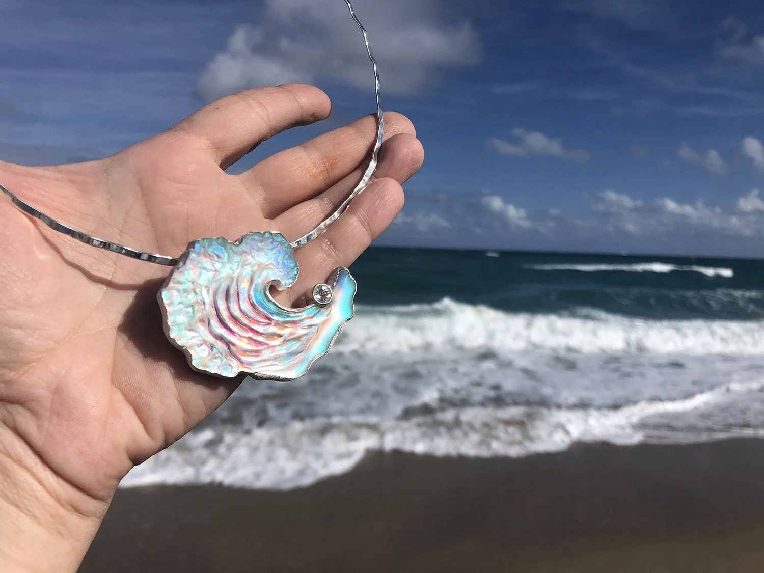 My background in metal gave me a foundation, but glass demanded something different. It required me to build a new language from the ground up. I knew I wanted color. I knew I wanted luminosity. Beyond that, I just started playing. What happens if I combine these? What does this material want to do? Years of that kind of open curiosity is what eventually produced the glass slab I work from today, something I had never seen used in jewelry or art glass making before. I wasn't trying to solve a problem. I was following the material wherever it wanted to go.