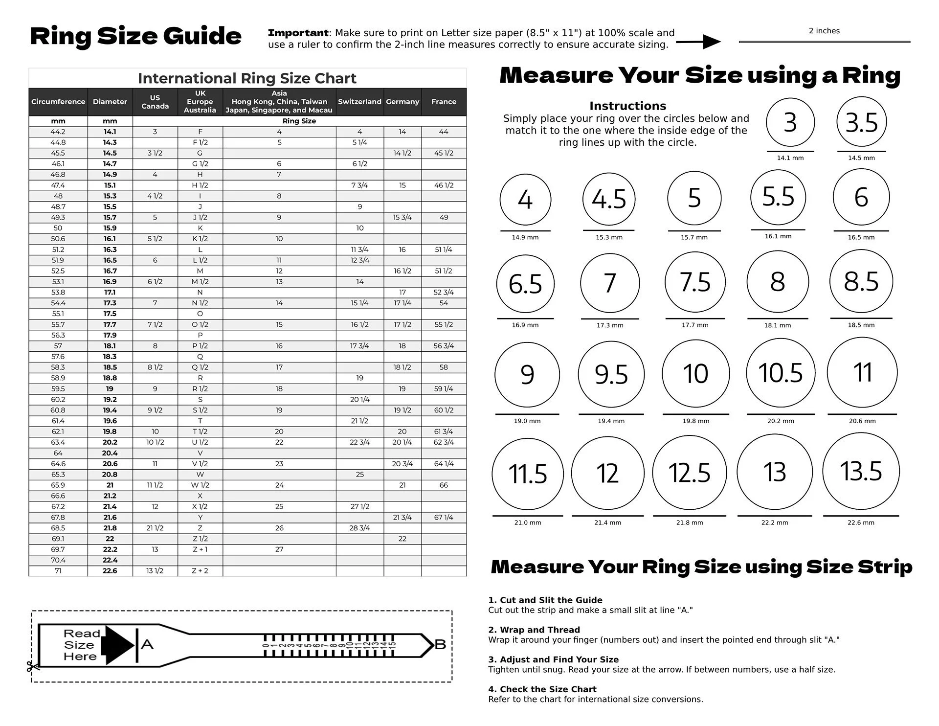 Print the page below to measure your ring size by clicking the download button. If you are unable to print, don’t worry, you can measure your finger with a strip of paper or ribbon.